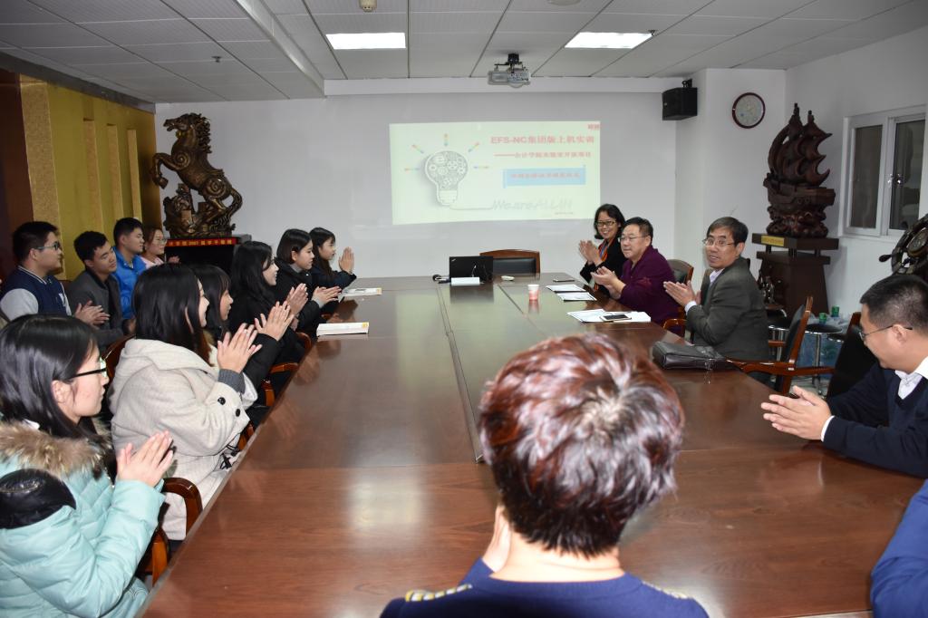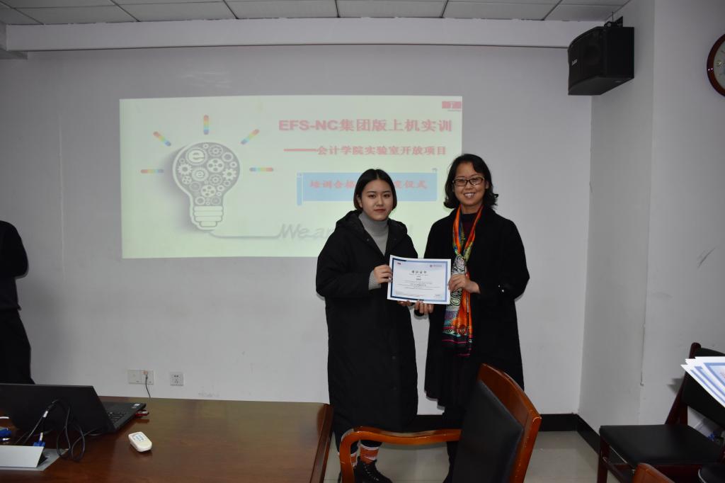 2017年11月23日,用友新道河北分公司总经理王立鹏、会计学院院长宋绍清为完成用友NC集团财务软件开放式实验的14位同学颁发了培训合格证书。参加颁发仪式的还有用友烟草河北分公司的经理张冬升。仪式结束后,宋绍清院长和王立朋总经理与学生探讨了未来企业对会计人才的需求方向。随后张冬升经理又为大家深入介绍了NC软件的架构及应用价值。